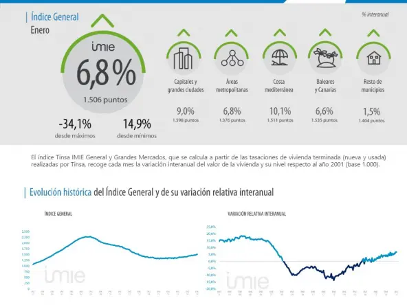 91% des 250 municipalités de la côte espagnole analysées dans le rapport ont augmenté le prix moyen des logements (1ère et 2ème résidence) au cours de l’année dernière, selon les évaluations de Tinsa. Les plus fortes augmentations, supérieures à 10%, se situent dans les îles Baléares (Manacor, Ses Salines, Llucmajor, Es Mercadal et Campos), la Communauté valencienne (Canet d’En Berenguer, Sagunto, Meliana et L’ Alfàs del Pi) et l’Andalousie (Motril, Algeciras, Malaga et Manilva).