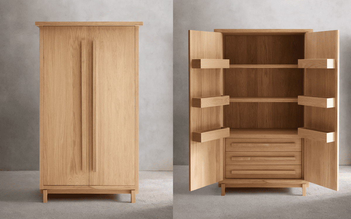 Le bois de chêne massif utilisé pour créer ce meuble est recouvert d’un panneau d’épicéa multicouche plaqué chêne qui le protège.