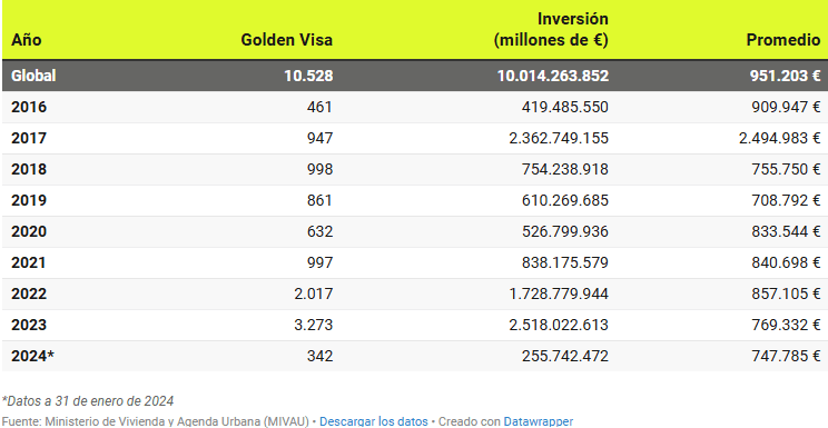 . Sur le nombre total d’acheteurs étrangers de logements d’une valeur supérieure à 500.000 euros, 49,59% correspondaient à des citoyens de l’UE et 50,41% à des citoyens hors UE (soit environ 4.500 logements). Ces derniers sont ceux qui peuvent bénéficier du permis de séjour, bien que le « visa d’or » puisse également être obtenu pour l’achat de plusieurs biens immobiliers dont le montant total est supérieur à 500 000 euros.