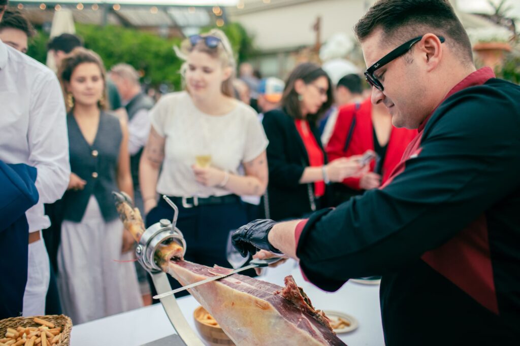 Partenaires et invités investissent la terrasse, rythmée par des stands gourmands et de jolies surprises. Jambon découpé à la volée par Jamón Pro, vins catalans signés Terra Remota, glaces artisanales de chez Aurélien Barcelona et gâteau d’anniversaire du Pain d’Éric & Benjamin : les papilles sont à la fête. Des ballons aux couleurs d’Equinox flottent dans le ciel grâce à Globos Eventos BCN, pendant que les sourires se capturent dans le photobooth de Smybox. L’Atelier Alpine, de son côté, expose un modèle A290 en hommage aux 70 ans de la marque automobile.