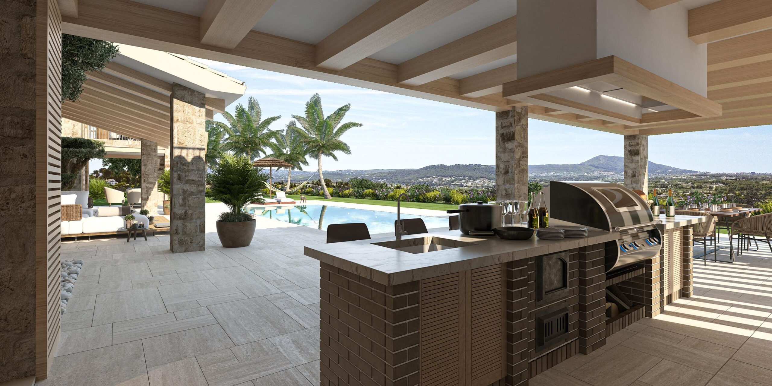 La piscine extérieure, conçue avec un effet miroir et des finitions en porcelaine, est entourée d’une vaste terrasse avec différentes zones et ambiances, y compris une cuisine avec un barbecue et un coin repas d’été, parfait pour profiter du climat méditerranéen.