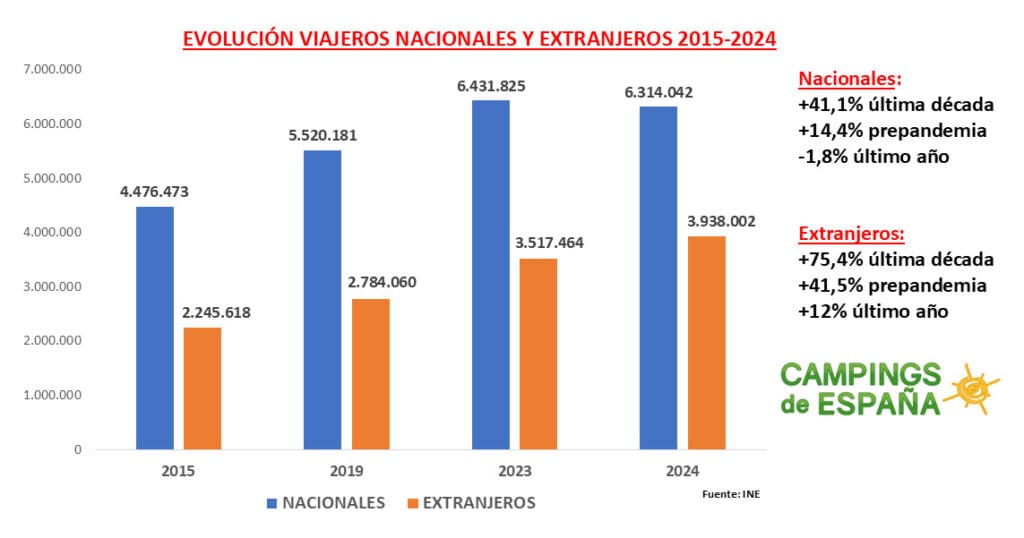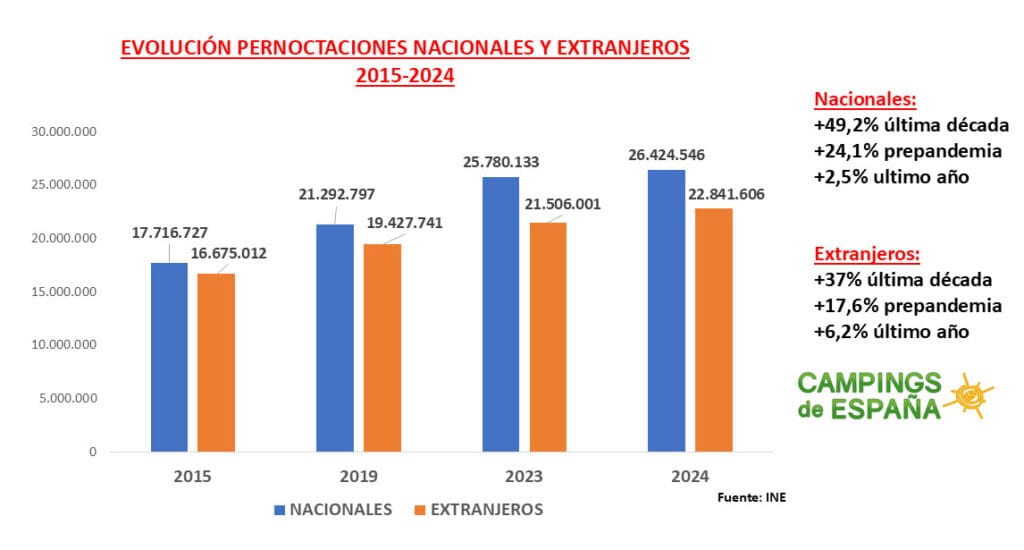 Les nuitées des nationaux et des étrangers continuent de battre des records : les campeurs espagnols passent en moyenne 4,2 nuits par an, tandis que les campeurs internationaux passent à 5,8 nuits, surtout en basse saison.