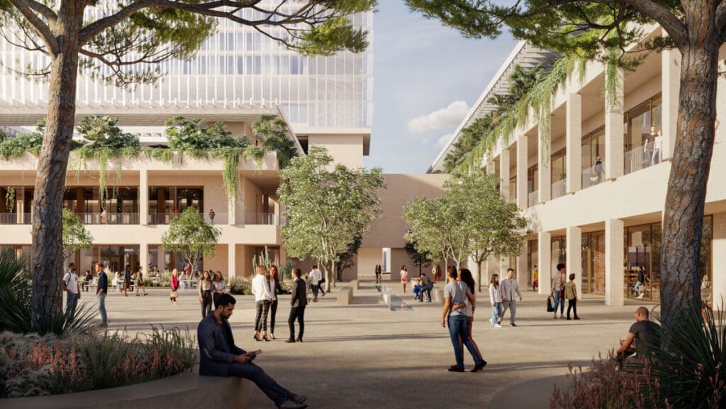 La proposition vise également à répondre aux conditions climatiques et aux normes environnementales élevées. Ainsi, dans les espaces à usage public, elle met en valeur le climat local avec de grands espaces ombragés reliés à l’extérieur et ouverts sur plusieurs façades, favorisant la ventilation naturelle et le passage de la brise marine, et ce dans le but de réduire la consommation d’énergie et d’améliorer le confort des usagers.