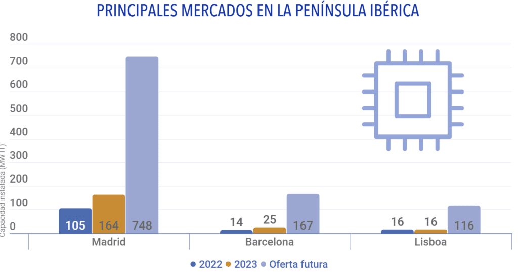 L’augmentation dans ces villes est liée aux projets annoncés avant 2022, tandis que la disponibilité future a ralenti dans les 2 villes, qui ne dépassent pas une croissance annuelle de 10%. Plus précisément, compte tenu des projets en cours, Madrid a augmenté sa capacité future de 8% pour atteindre 584 MW IT et Barcelone de 7% pour atteindre 142 MW IT.