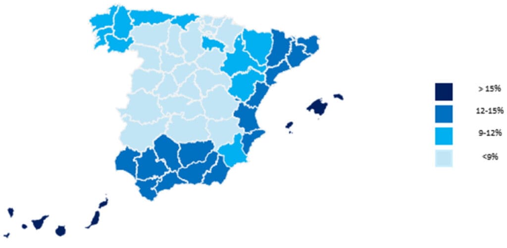 Contribution du tourisme à l’économie. Carte par communauté autonome, poids dans le PIB. Source : Baromètre Braintrust basé sur les données de l’INE