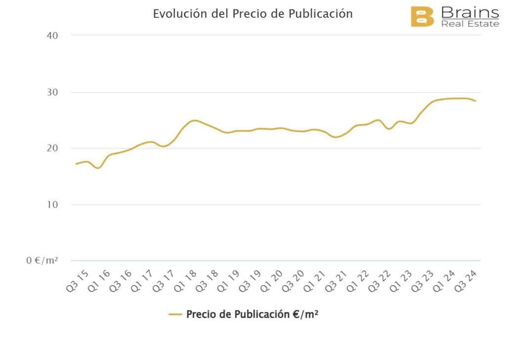 Aujourd’hui, le prix des bureaux à louer dans le quartier de Justicia s’élève en moyenne à 28,4 euros par m2 et par mois, soit une hausse de 0,7% par rapport à il y a 12 mois, mais une baisse de 1,6% par rapport à il y a 3 mois, selon les données de la plateforme de big data immobilière Brains Real Estate.