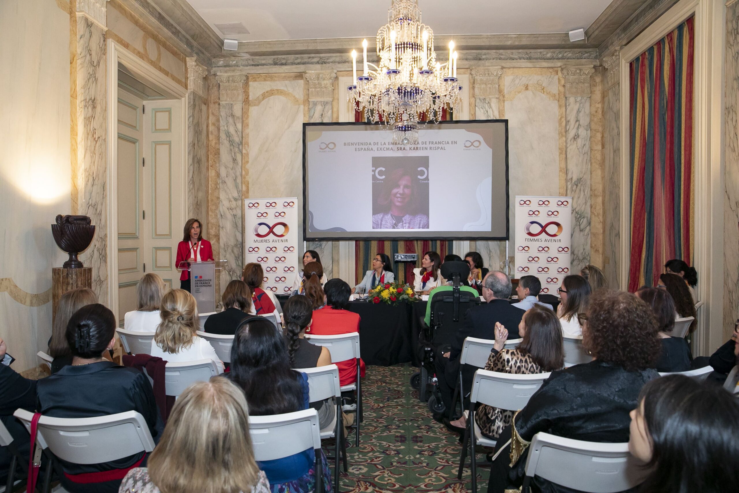 Son Excellence Kareen Rispal, Ambassadrice de France en Espagne, a souhaité la bienvenue aux participantes et a rappelé le travail réalisé par l’institution pour informer la société espagnole de la position de la France sur des questions aussi importantes que l’avortement, la traite des êtres humains, la prostitution et la nécessité de l’égalité des sexes dans l’entreprise, afin de promouvoir la défense des droits des femmes et de l’égalité des sexes, piliers fondamentaux de l’action française en Espagne.