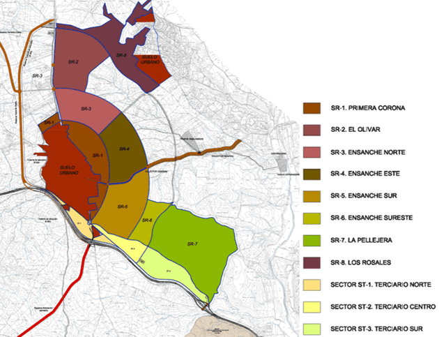 En ce qui concerne le degré d’avancement des différents secteurs, les secteurs les plus avancés en termes d’autorisations d’urbanisme sont SR-1 Primera Corona, SR-2 Olivar, SR-5 Ensanche Sur et SR-7 La Pellejera.