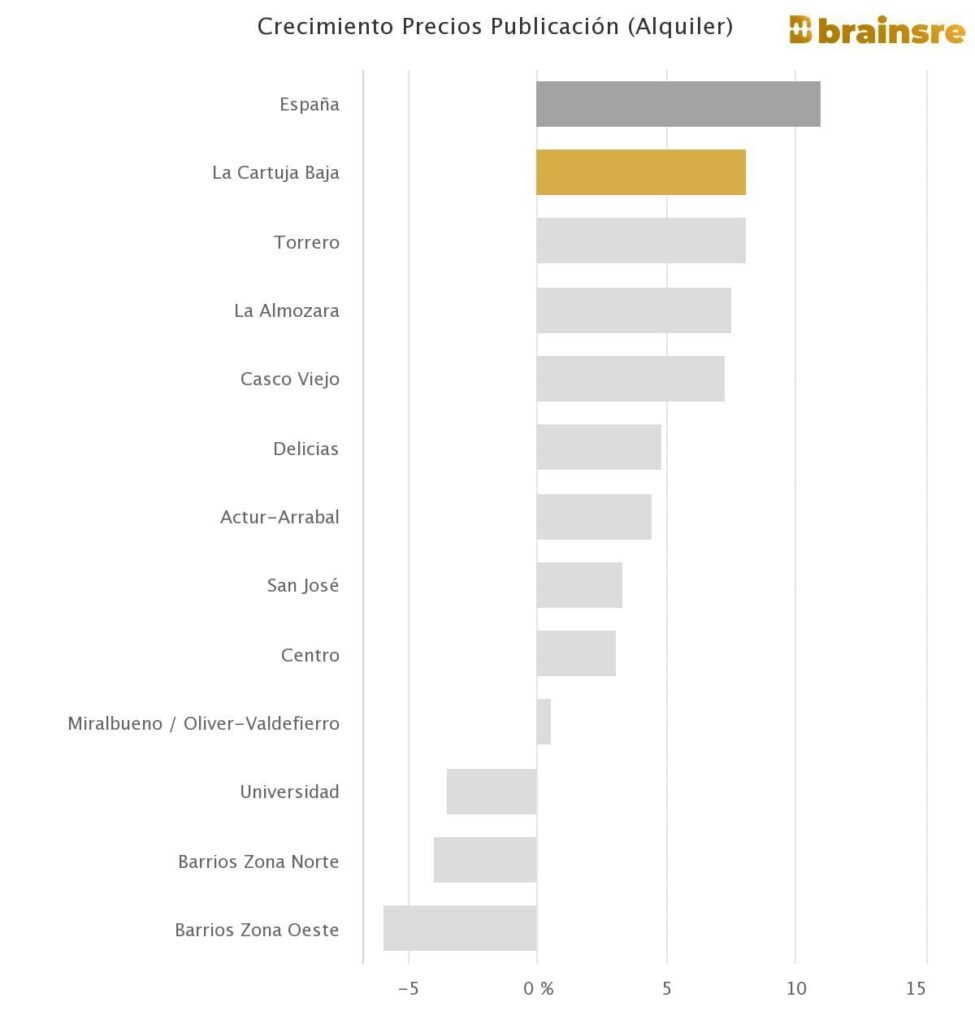 Il convient de noter que La Cartuja Baja est le quartier où la croissance des prix a été la plus forte au cours de l’année écoulée. Dans ce quartier de Saragosse, le pourcentage du salaire consacré au logement locatif est de 21,9%.