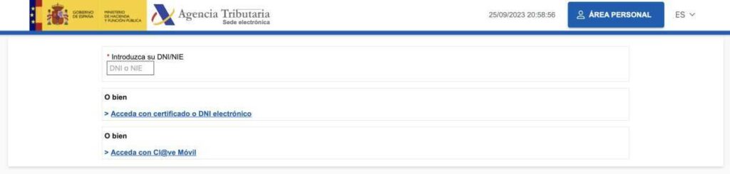 - Accédez au site de l’Agencia Tributaria et utilisez votre carte d’identité électronique, système Cl@ve ou certificat électronique pour entrer.