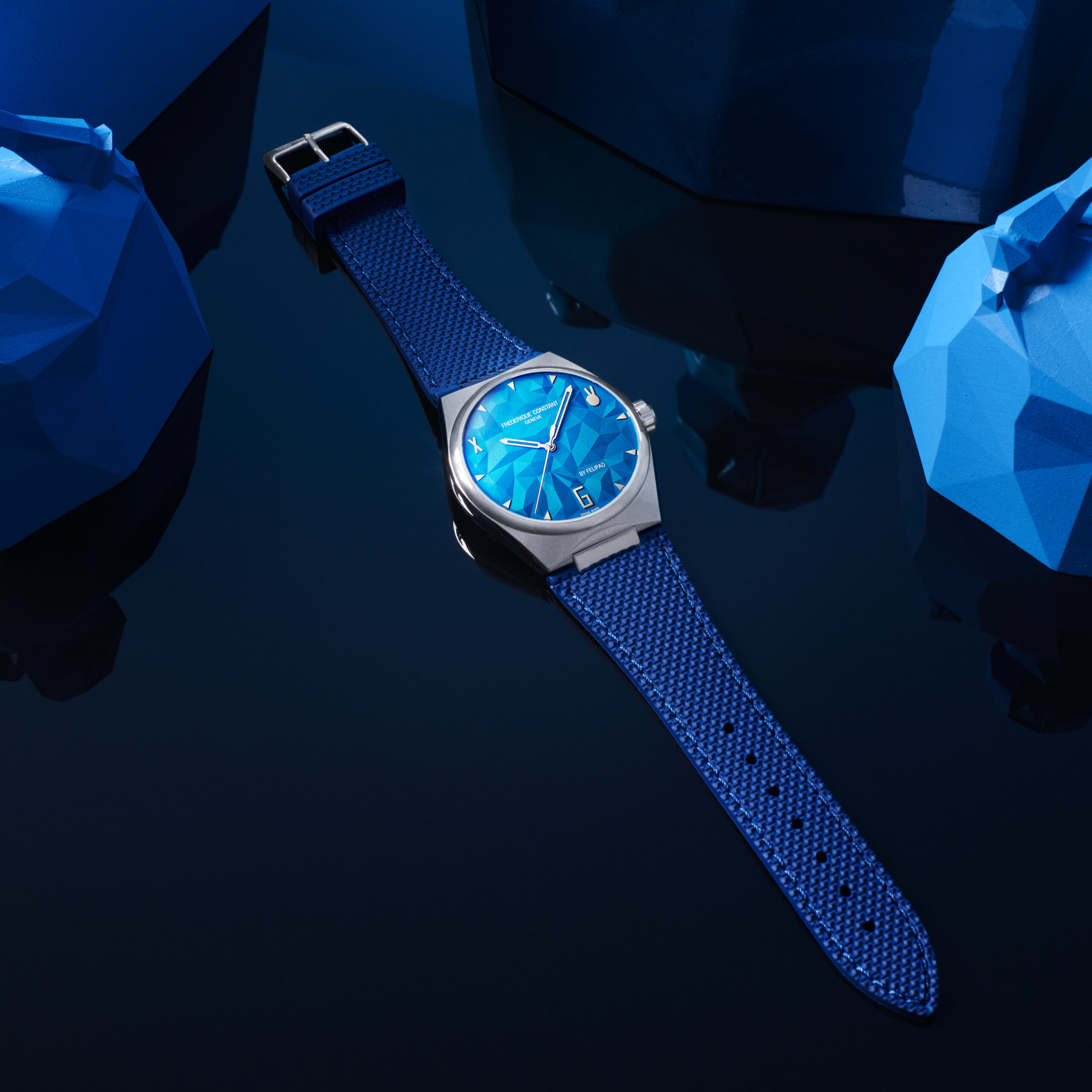 La collection Highlife renouvelée a été choisie pour faire l’objet d’une intervention du sculpteur espagnol Felipao. Il s’agit d’une édition limitée numérotée de 100 pièces, présentée dans un boîtier tripartite en acier poli et satiné de 41 mm de diamètre avec un cadran en céramique polyédrique bleu conçu par Felipao. Le cadran combine trois symboles représentatifs de trois moments importants de l’histoire : le présent, représenté par l’émoticône de la paix, le 6 hérité des chiffres arabes et le X des chiffres romains.
