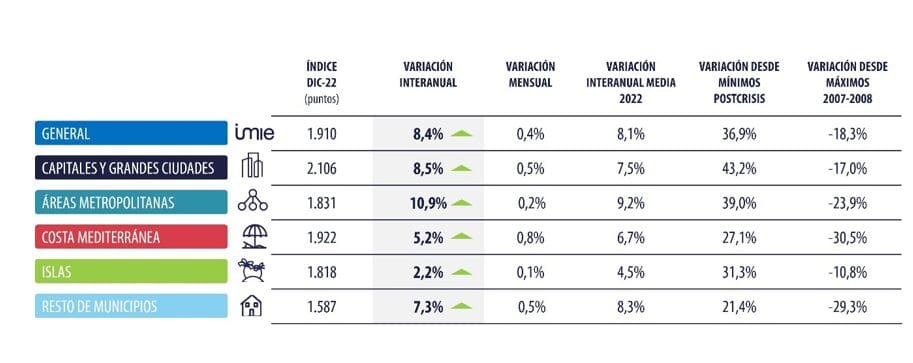 Bien que la variation mensuelle soit inférieure aux 1,1% enregistrés en novembre et aux 1,6% enregistrés en octobre, une croissance positive continue d’être observée dans tous les groupes analysés. La dynamique haussière de décembre est tirée par le groupe ‘Côte Méditerranéen’ (+0,8% en rythme mensuel), suivi par ‘Capitales et grandes villes’ et ‘Autres communes’ (+0,5% dans les deux cas).