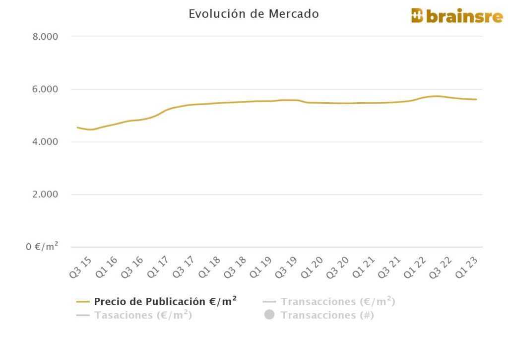 Le prix des logements dans la municipalité de Barcelone, qui compte plus de 1,6 million d’habitants, la deuxième ville la plus peuplée de tout le pays, s’élève actuellement à 4.643 euros par m2, ce qui représente une hausse de 2,2% en glissement annuel et une légère augmentation de 0,1% en comparaison trimestrielle.