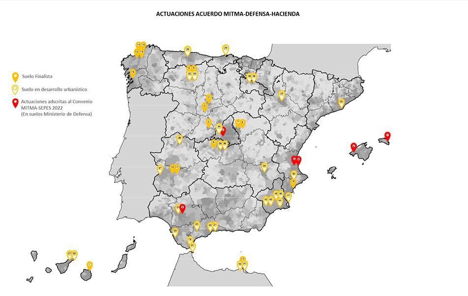 Les terrains de défense concernés par cette initiative sont répartis entre des municipalités d’Andalousie, d’Aragon, des Asturies, de Cantabrie, des îles Canaries, de Catalogne, de Castille-La Manche, de Castille-et-León, d’Estrémadure, de Galice, de La Rioja, de Madrid, de Murcie et de Valence, ainsi que des villes autonomes de Ceuta et de Melilla.