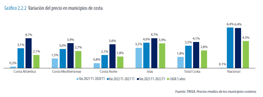 Les prix des logements ont augmenté d’une année sur l’autre de 4 à 5% sur les quatre principales côtes ou pentes analysées. La croissance moyenne (TCAC) au cours des cinq dernières années dans l’ensemble des municipalités côtières a été de 2,8% (contre 4,3% au niveau national), tirée par les îles (+3,9%), où la concurrence pour l’espace est plus forte, et plus faible sur la côte nord (+1,8%).