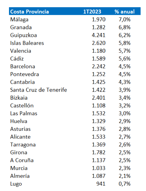 > Les logements sur la côte espagnole (1ère et 2ème résidences) ont augmenté de 4,1% en glissement annuel au premier trimestre 2023, contre 3,5% un an plus tôt.