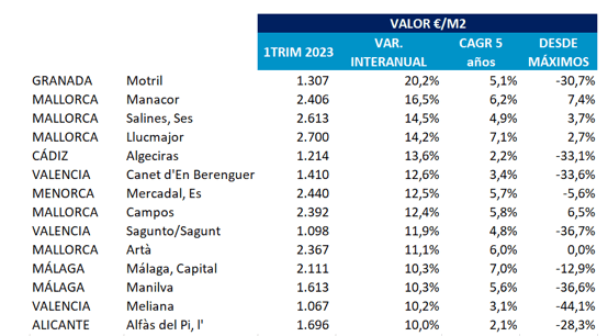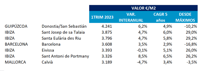 En valeur absolue, les résidences principales et secondaires les plus élevées, supérieures à 3.000 €/m2, sont situées sur l’île d’Ibiza (Sant José de sa Talaia, Santa Eulària des Riu, Ibiza et Sant Antoni de Portmany) et à Calviá (Mallorca). Les capitales de Saint-Sébastien et de Barcelone font également partie des enclaves ayant les plus hauts €/m2 sur la côte, bien que dans leur cas le marché de la résidence principale exerce une grande influence.