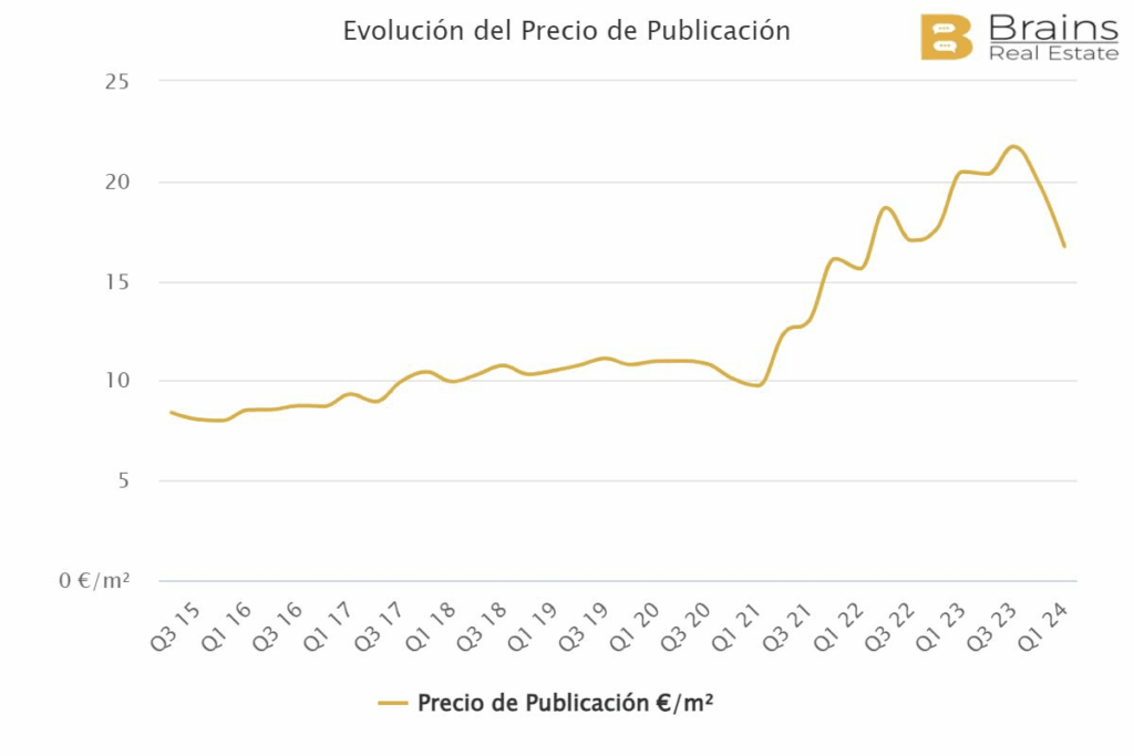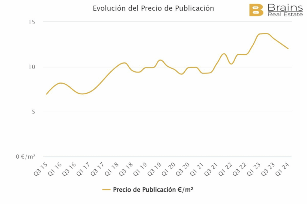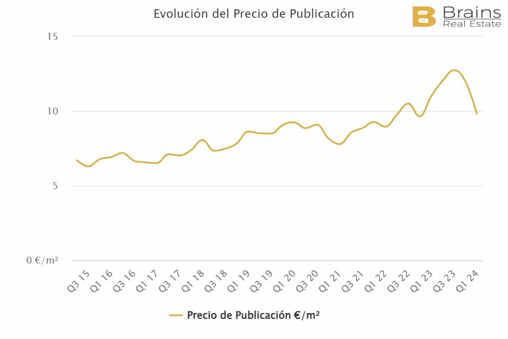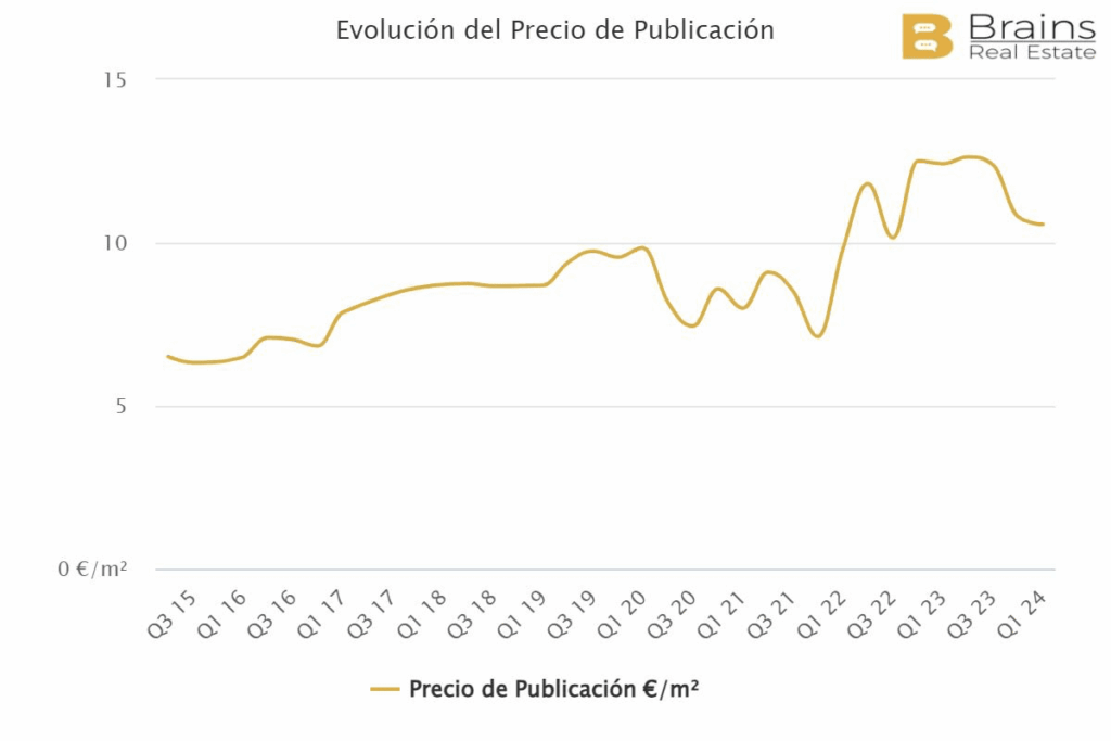 Nous pouvons voir dans le graphique comment le prix de la location a fluctué de manière significative au cours des dernières années, après avoir enregistré des hausses consécutives entre la période allant de la fin 2022 au 3ème trimestre 2023 (12,7€ par m2 par mois et lorsqu’il a atteint son chiffre record), date à partir de laquelle il a commencé à baisser jusqu’à aujourd’hui.