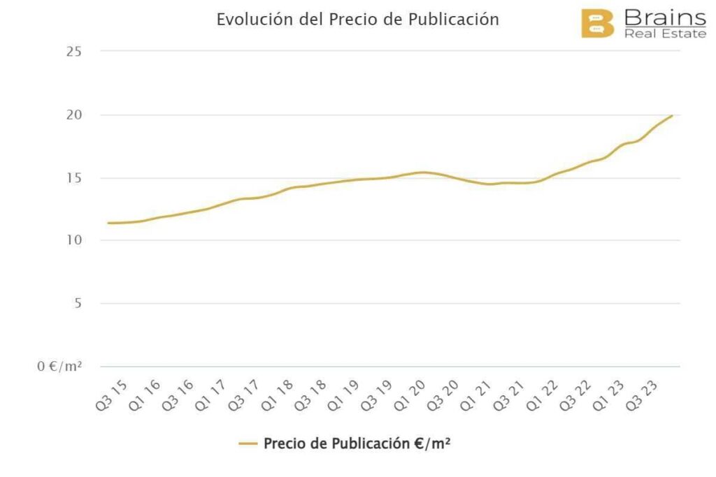 Dans le cas des appartements d’une chambre, le prix est de 1.337€ par mois (23,7€ par m2/mois), et le prix d’achat est de 274.282€. Si nous revenons au prix d’il y a 4 ans, il est descendu à 17,3€/m2/mois, il a donc augmenté de 37%.