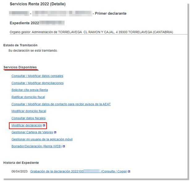 Une fois à l’intérieur, allez à la rubrique « Rédaction / service de traitement des déclarations fiscales (Renta WEB) » ou « Modification d’une déclaration fiscale déjà déposée ». Sélectionnez ensuite « Services disponibles »/ »Modifier la déclaration ».