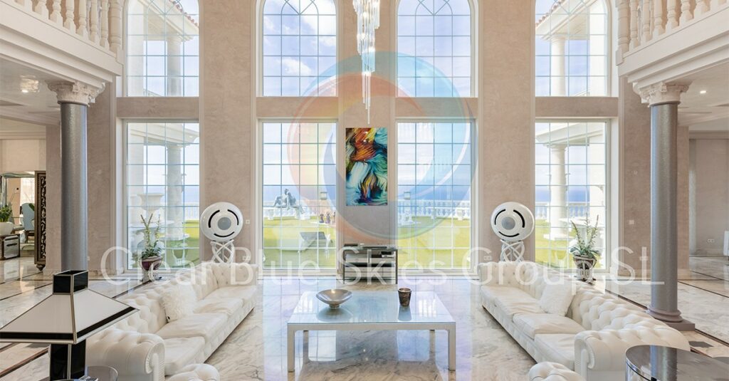 Un large escalier permet également d’accéder au niveau intermédiaire, où se trouve l’immense salon principal avec ses 5 fenêtres de 8 mètres de haut. L’incroyable luminosité est une constante de cette villa, qui dispose d’un second salon, d’un bar et d’un double bureau au même étage.