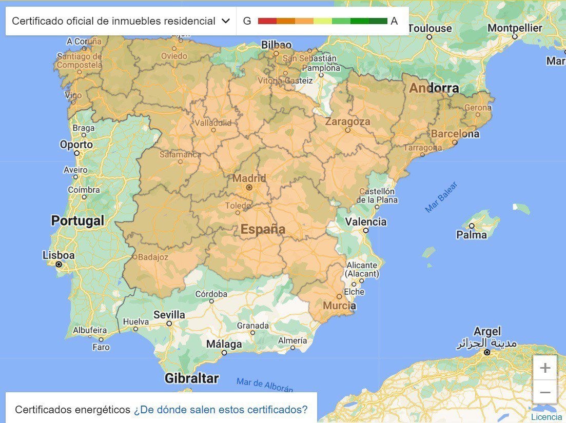 Le géoportail permet d’accéder à la carte de chaque localité et de connaître graphiquement, en suivant le code officiel de couleurs et de lettres de l’étiquetage énergétique des bâtiments (de la lettre A à la lettre G et du vert foncé au rouge), le certificat qui correspond à chaque maison d’un même immeuble.
