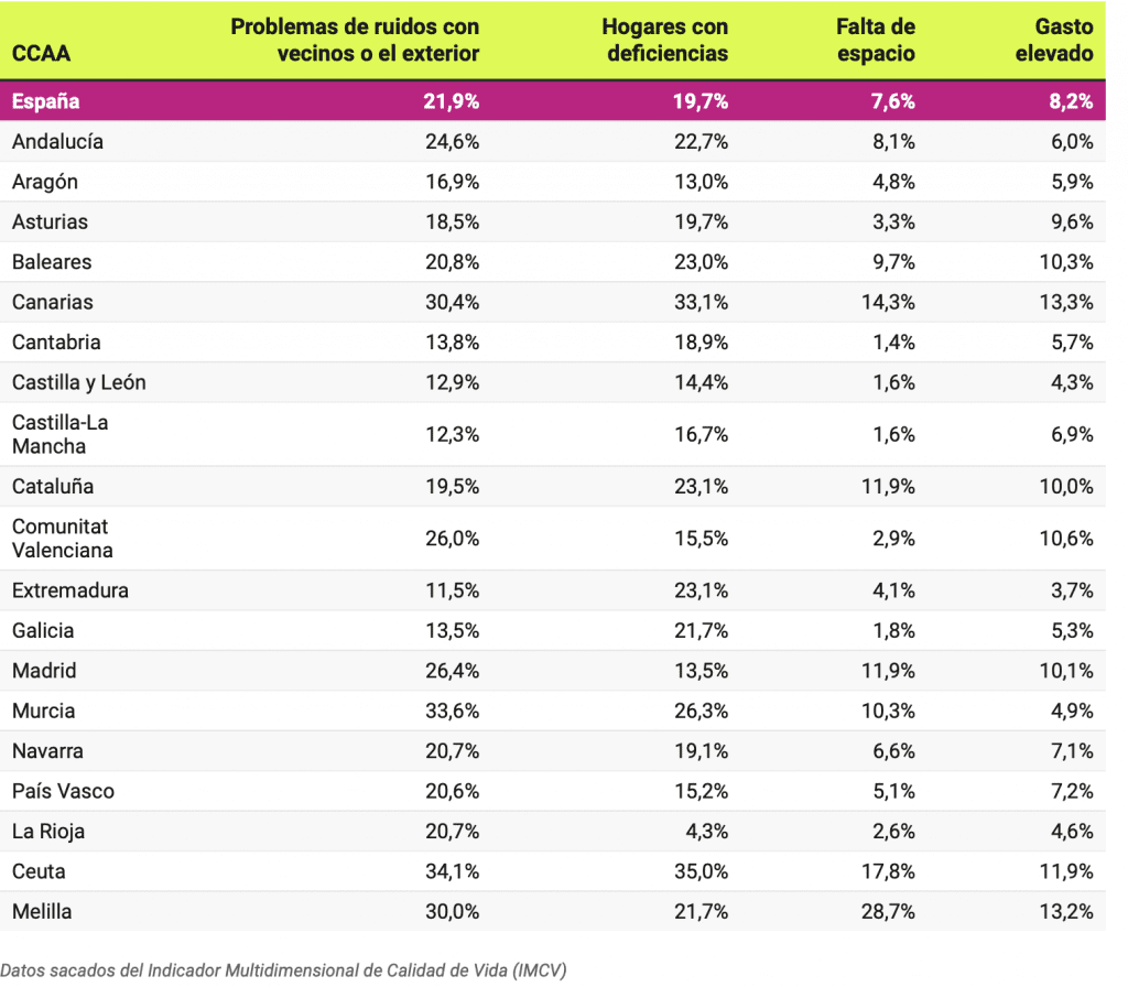 Concernant les carences en logement, les noms des régions autonomes sont répétés, mais dans un ordre différent Ceuta (35%), Canarias (33,1%) et Murcie (26,3%). La population qui se plaignait le moins de ces problèmes à la maison a été détectée à La Rioja (4,3 %), en Aragon (13 %) et à Madrid (13,5 %). Une fois encore, Ceuta et les îles Canaries ont vu leurs problèmes s’aggraver entre 2019 et 2020 de plus de 15 points de pourcentage, accompagnés de la Galice. Comme dans le cas précédent, La Rioja et les Asturies ont vu leurs pourcentages s’améliorer, réduisant les cas de problèmes de logement ou, du moins, la perception subjective de la population.