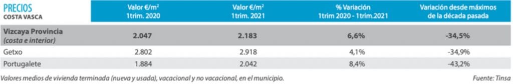 Les prix montrent des augmentations dans les segments des nouvelles constructions et des logements usagés. La commune de Getxo suit un modèle différent des autres, puisque sa tendance se poursuit dans la même veine que ces dernières années. Les marchés de la première et de la deuxième résidence affichent un comportement différent.