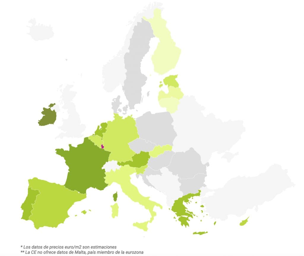 L’exemple est démontré avec la Grèce, où il faut en moyenne 12 ans pour payer un logement, avec un prix moyen de 1.300 euros/m2, ce qui signifie que leurs salaires sont inférieurs à la normale. Au contraire, dans des pays comme l’Allemagne ou la Belgique, où leurs prix dépassent 2.500 euros/m2, l’un des plus élevés de la liste, ils passent moins d’années à payer leur logement, compte tenu de leur revenu familial plus élevé.