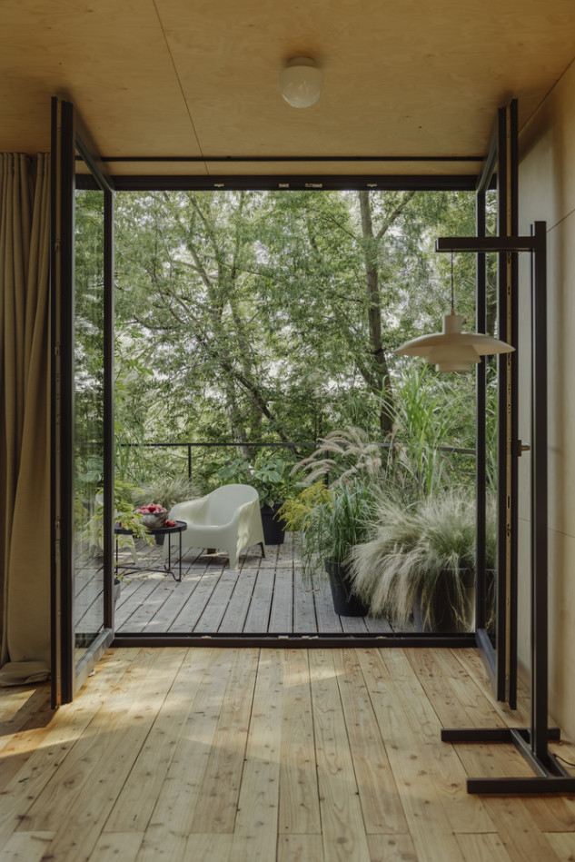 Le résultat est un espace de vie à l’année composé de deux conteneurs de transport adaptés, 12 x 2,5 mètres et 2,9 mètres de haut. La cabane a été partiellement placée sur le toit de conteneurs précédemment debout, qui servent d’espace de stockage pour un jardin. En raison de la pente du terrain et des vues, le solide a été déplacé sur la moitié de sa longueur, créant une grande terrasse d’un côté face à la rivière voisine, et de l’autre côté, il s’est approché de la parcelle, diminuant la hauteur nécessaire pour accéder au intérieur.