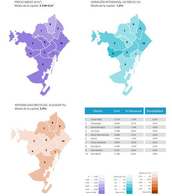 Les quartiers les plus chers, situés à Madrid et Barcelone, avec des chiffres supérieurs à 4.000 € / m2 , sont ceux de Salamanca, Chamberí, Centro, Chamartín et Retiro (Madrid), et Sarrià-Sant Gervasi, Les Corts et Eixample (Barcelone).