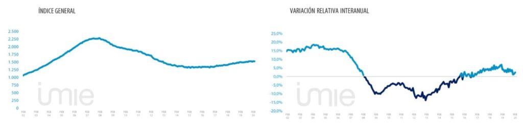 L’indice Tinsa IMIE General and Large Markets, qui est calculé sur la base des évaluations de logements achevés (neufs et d’occasion) effectuées par Tinsa, montre l’évolution d’une année sur l’autre de la valeur des logements et son niveau par rapport à 2001 (base 1.000).