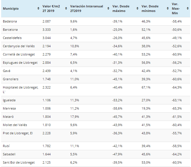 Les prix dans la province de Barcelone ont connu un ajustement en pourcentage plus prononcé pendant la crise que ceux des municipalités de la Communauté de Madrid. Dix des 25 localités les plus peuplées de la province de Barcelone ont connu une forte baisse, dépassant les 60%, allant des plus hauts d’avant-crise aux plus bas. Ainsi, Manresa (-65,3%), Terrasa (-64,4%), Hospitalet de Llobregat (-64,3%), Sabadell (-64,2%), Vic (-63,6%), Igualada (-63,1%), Villafraca del Penedés (-63%), Santa Coloma de Gramenet (-62,8%), Mataró (-61,5%) et Cornellà del Llobregat (-60,9%) ont eu le plus grand ajustement pendant la crise. Sa récupération a été inégale. Par exemple, alors que Manresa n’a récupéré que 19,3%, Vic et Villafranca del Penedés 20,3% et Igualada 27%; d’autres comme Sabadell, Terrasa, Cornellá de Llobregat ou Sant Boi ont presque augmenté leur valeur entre 45% et 53%, loin de l’Hospitalet de Llobregat, qui a récupéré plus de 67%.