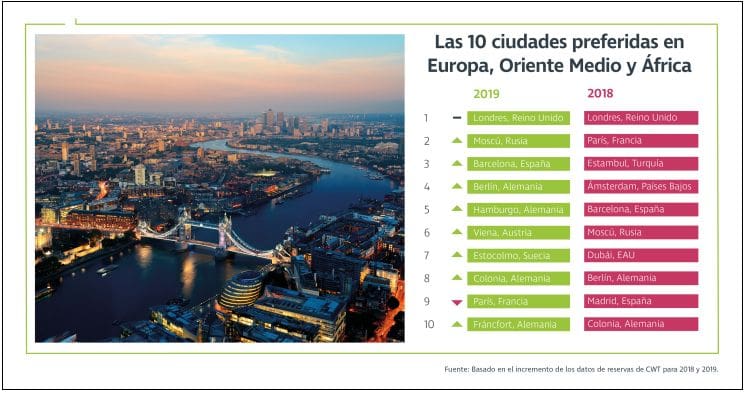 Madrid a été classée neuvième en 2018, après avoir été sixième en 2017. Selon un rapport de CWT Meetings & Events, Londres restera la ville européenne privilégiée pour les réunions et événements d’entreprise en 2019, Barcelone passe à la troisième place, tandis que Madrid quitte le Top 10 des villes européennes en 2019-