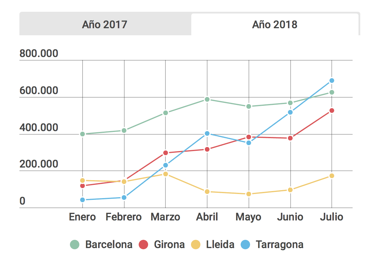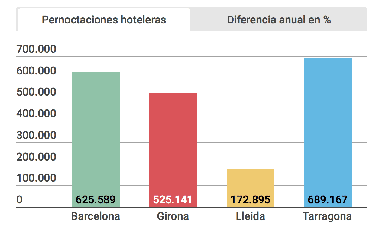 Cependant, cette baisse n’est pas homogène dans toutes les destinations mais se concentre principalement dans deux provinces: Barcelone (-9,87%) et Tarragone (-8%). En revanche, dans la région de Gérone, il n’y a guère eu de baisse (-0,4%) et dans les comtés de Lleida, il y a même eu une croissance de 4,7%. Cependant, lorsque le mois de juillet est arrivé, les chutes étaient plus répandues. Dans l’infographie interactive suivante, nous pouvons visualiser les données plus en détail. De janvier à juillet, les hôtels en Catalogne ont perdu au total un million de nuitées de voyageurs étrangers et espagnols par rapport à la même période l’an dernier.