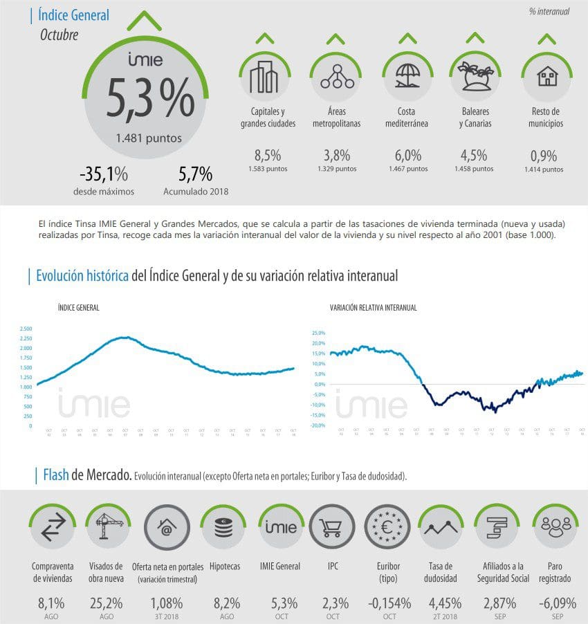 Le logement a enregistré une réévaluation annuelle moyenne de 5,3% en octobre, tirée par les capitales et les grandes villes, où la valeur moyenne a augmenté de 8,5% au cours de la dernière année (TINSA)