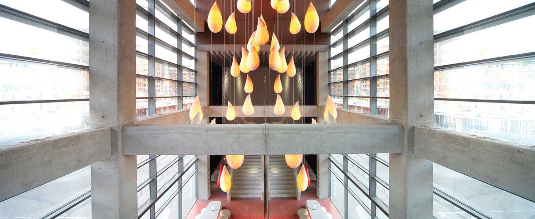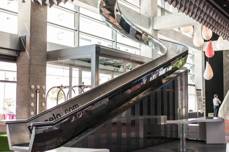 D’une hauteur de six mètres, le toboggan en acier (autrement appelé EDHA : structure glissante pour personnes audacieuses) est au cœur de la réception qui se remarque aussi grâce à l’utilisation de couleurs acidulées. Il relie le premier étage et l’entrée de l’hôtel. Le lobby du Barceló Málaga ne surprend pas que les voyageurs de passage, il a en effet été reconnu par plusieurs prix, dont celui, en avril dernier, de la Lettre d’argent pour la meilleure enseigne en design d’intérieur.