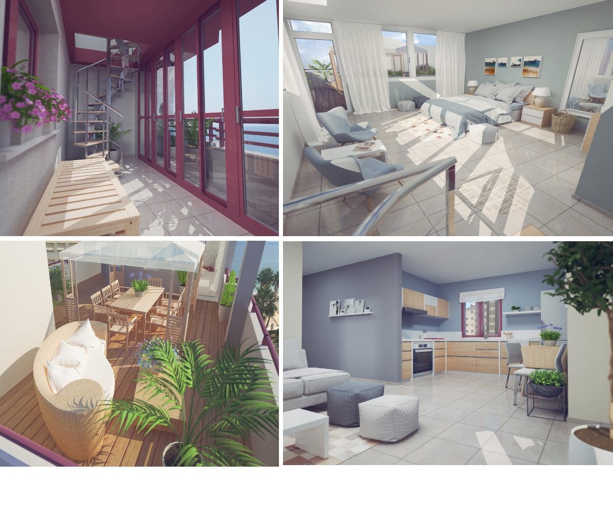 Au premier étage, vous trouverez le salon, la cuisine, deux chambres, deux salles de bains et une terrasse couverte. Le deuxième étage se compose d’une autre chambre, d’une salle de bains et d’une magnifique terrasse ouverte offrant une vue incroyable sur la mer Méditerranée. L’appartement est entièrement meublé et dispose d’armoires encastrées dans toutes ses pièces. Sa superficie totale est de 155,40 m2.
