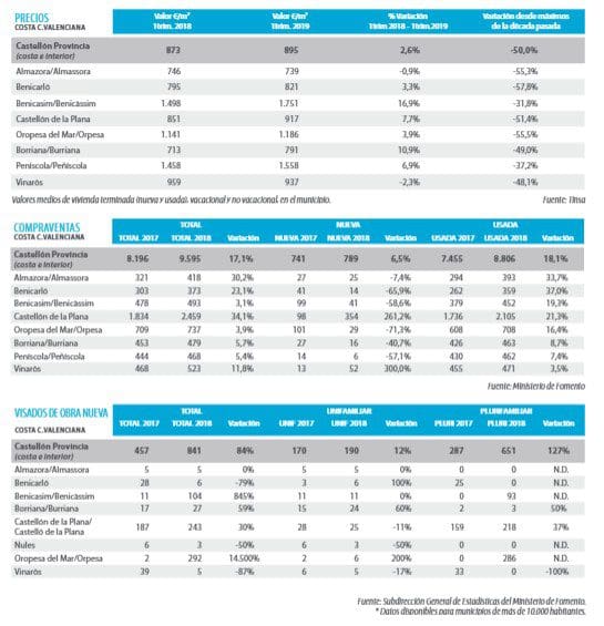 Le marché des achats en général est plus important que le marché de la location, sauf dans les villes touristiques telles que Oropesa, Benicàssim et Peñíscola (surtout en haute saison).