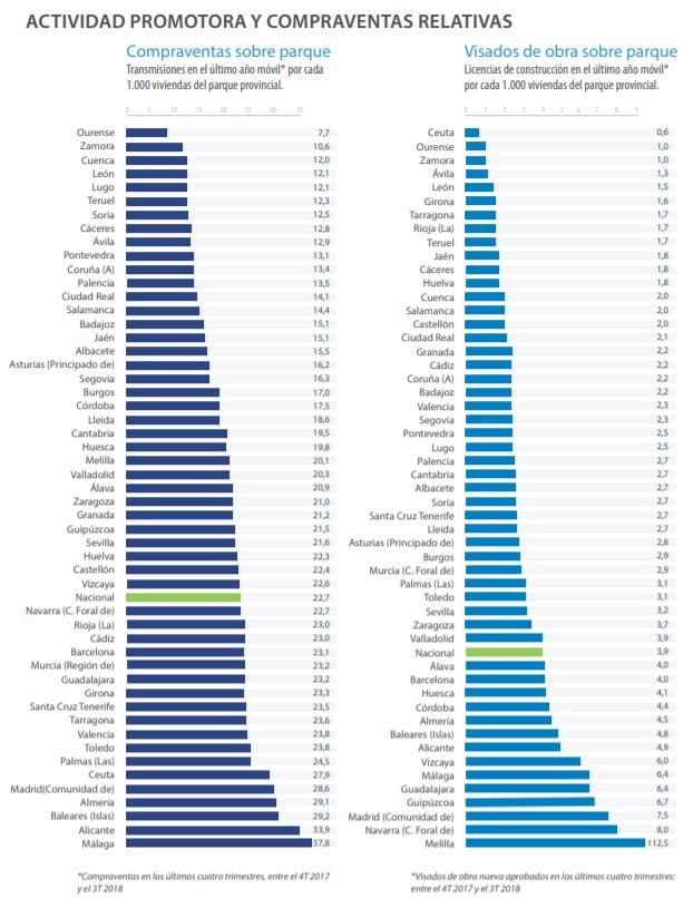 Le volume de vente d’habitations en Espagne au cours de l’année 2018 atteint les 22,7 transactions de logement pour 1 000 logements existants dans le pays, contre 22,4 achats au trimestre précédent. Malaga et Alicante demeurent les provinces où davantage de transactions sont effectuées proportionnellement à leur parc résidentiel: 37,8 et 33,9 transactions pour 1 000 unités construites, respectivement.