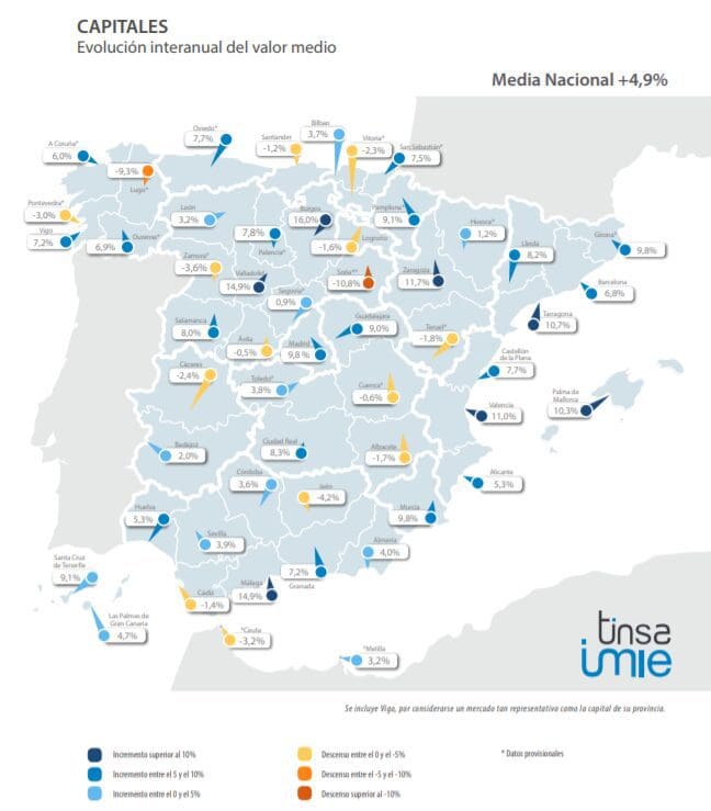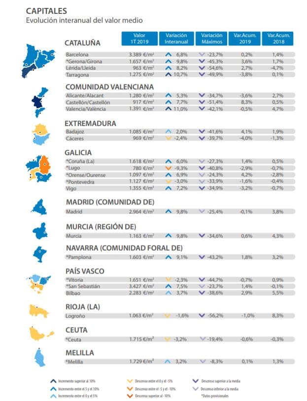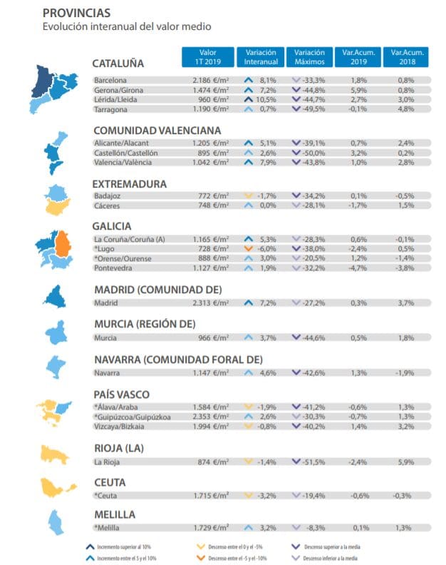 On remarque que les valeurs provinciales les plus élevées se trouvent à Guipúzcoa (2 353 €/m2) , Madrid (2 313 €/m2), Barcelone (2 186 €/m2) et les îles Baléares (2 166 €/m2), tandis que le prix moyen le moins cher parmi les provinces espagnoles est situé à Cuenca (688 €/m2), Teruel (696 €/m2), Ville royale (702 €/m2) et Lugo (728 €/m2).