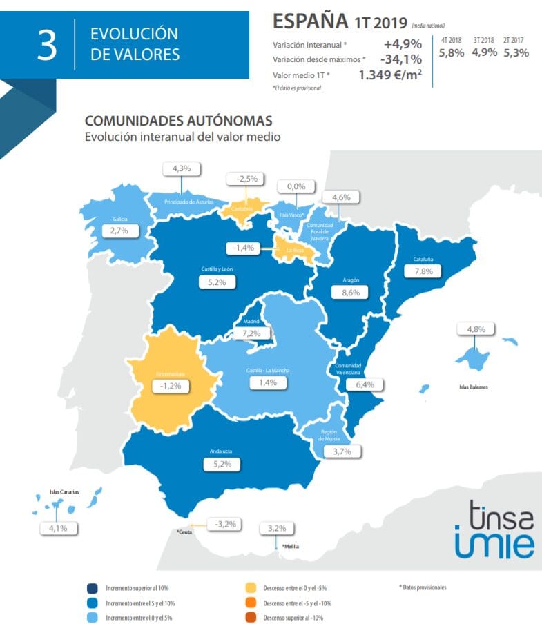 Le rapport Tinsa IMIE Local Markets pour le premier trimestre de 2019 relate une augmentation de 4,9% par rapport à l’année précédente.