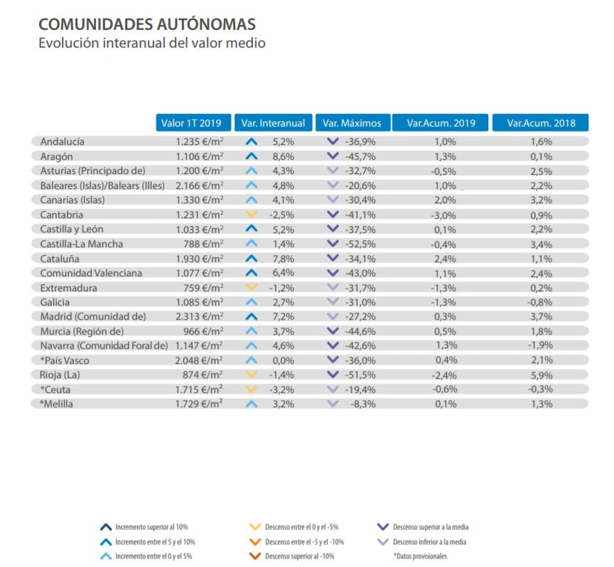 Six régions (Aragon, Catalogne, Communauté de Madrid, Communauté valencienne, Andalousie et Castille-et-León) augmentent plus de 5% en valeur annuelle. En termes trimestriels, la Catalogne et les îles Canaries sont les deux seules communautés qui deviennent plus chères, à plus de 2%, tandis que l’Estrémadure, La Rioja et Cantabrie sont, avec la Galice, celles qui enregistrent des chutes supérieures à 1% par rapport au dernier trimestre de 2018.
