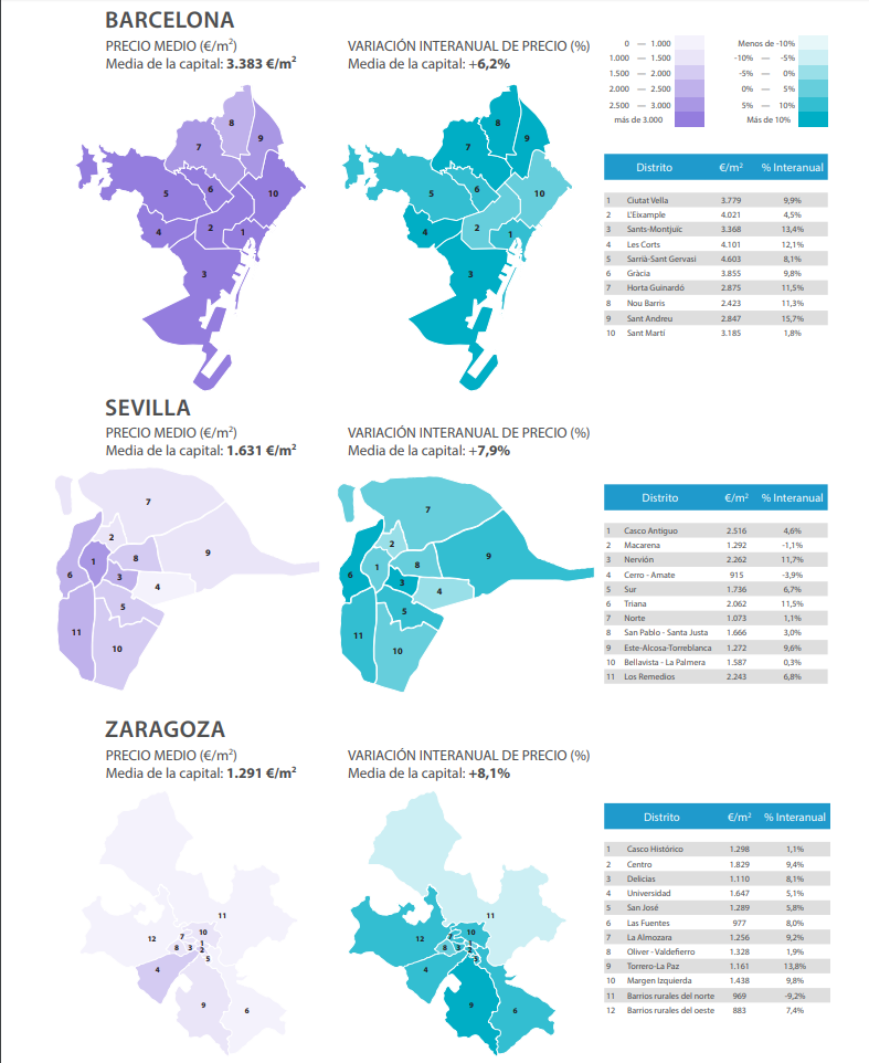 À Séville, une croissance interannuelle de plus de 10% a également été observée dans les districts de Nervión (+ 11,7%) et de Triana (+ 11,5%), ce qui contraste avec les baisses observées chez Cerro-Amate (-3,9%) et Macarena (-1,1%). Saragosse, en revanche, commence à dynamiser son marché résidentiel, avec un seul district négatif: les Barrios Rurales del Norte (-9,2%). En revanche, les plus fortes augmentations interannuelles se situent à Torrero-La Paz (+ 13,8%) et dans le district du Centre (+ 9,4%).